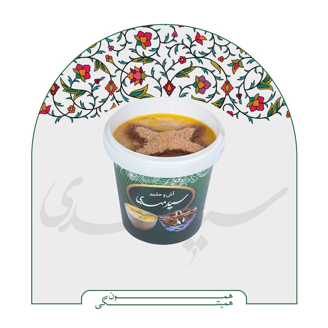 حدود500 گرم آش رشته با تزئین کشک، پیاز داغ و نعنا داغ بهمراه یک بسته نان لواش و کاتلری